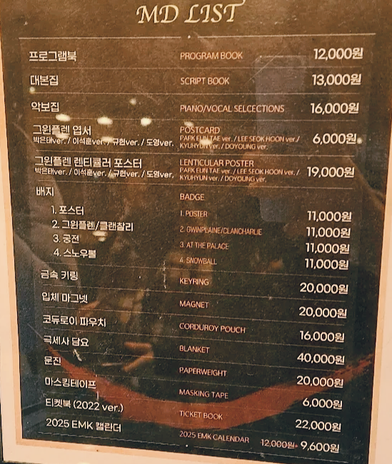 웃는남자 MD 는 대본집, 악보집, 포스터, 문진, 마스팅 테이프등 정말 다양했습니다.
