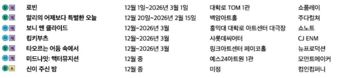 12월은 연말 라인업으로 킹키부츠가 제일 인기가 많을것 같다. 소극장 무대인 로빈, 미드나잇:액터뮤지션, 타오르는 어둠 속에서도 기대가 되는 작품이다.