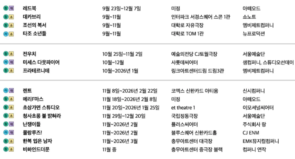2025년 뮤지컬 공연일정이 기획사별로 월별로 공개가 되었다. 아직 발표하지 않은 기획사도 있지만 초연, 재연, 내한공연등 다양한 뮤지컬 작품들이 한해를 가득채웠다. 월별 뮤지컬 일정을 확인하고 관심있는 뮤지컬은 미리 기획사 인스타그램을 통해 티켓오픈일정을 확인해 두고 매번 새로운 정보를 입수하는것이 중요하다.