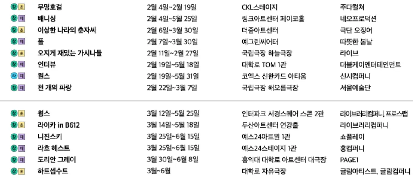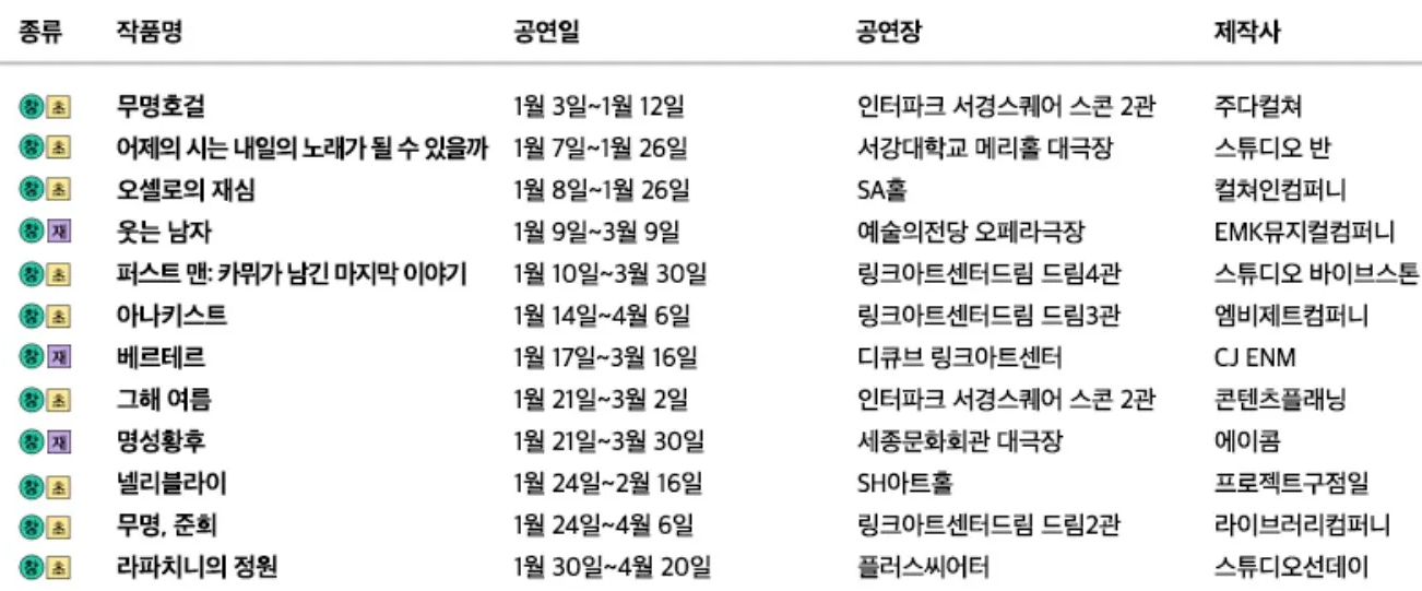 1월에 뮤지컬 라인업이 모두 창작뮤지컬로 채워져 있는 점도 특이점이다.
