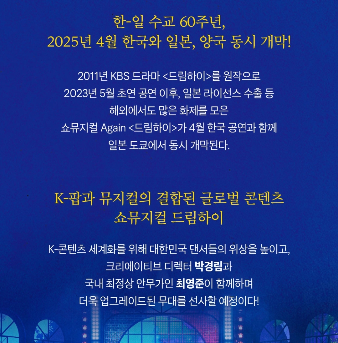 한일 수교 60주년 기념으로 4월에 한국과 일본에서 동시개막을 하는 쇼뮤지컬 드림하이는 K-팝과 뮤지컬이 결합된 신선한 무대가 될 것 같습니다.